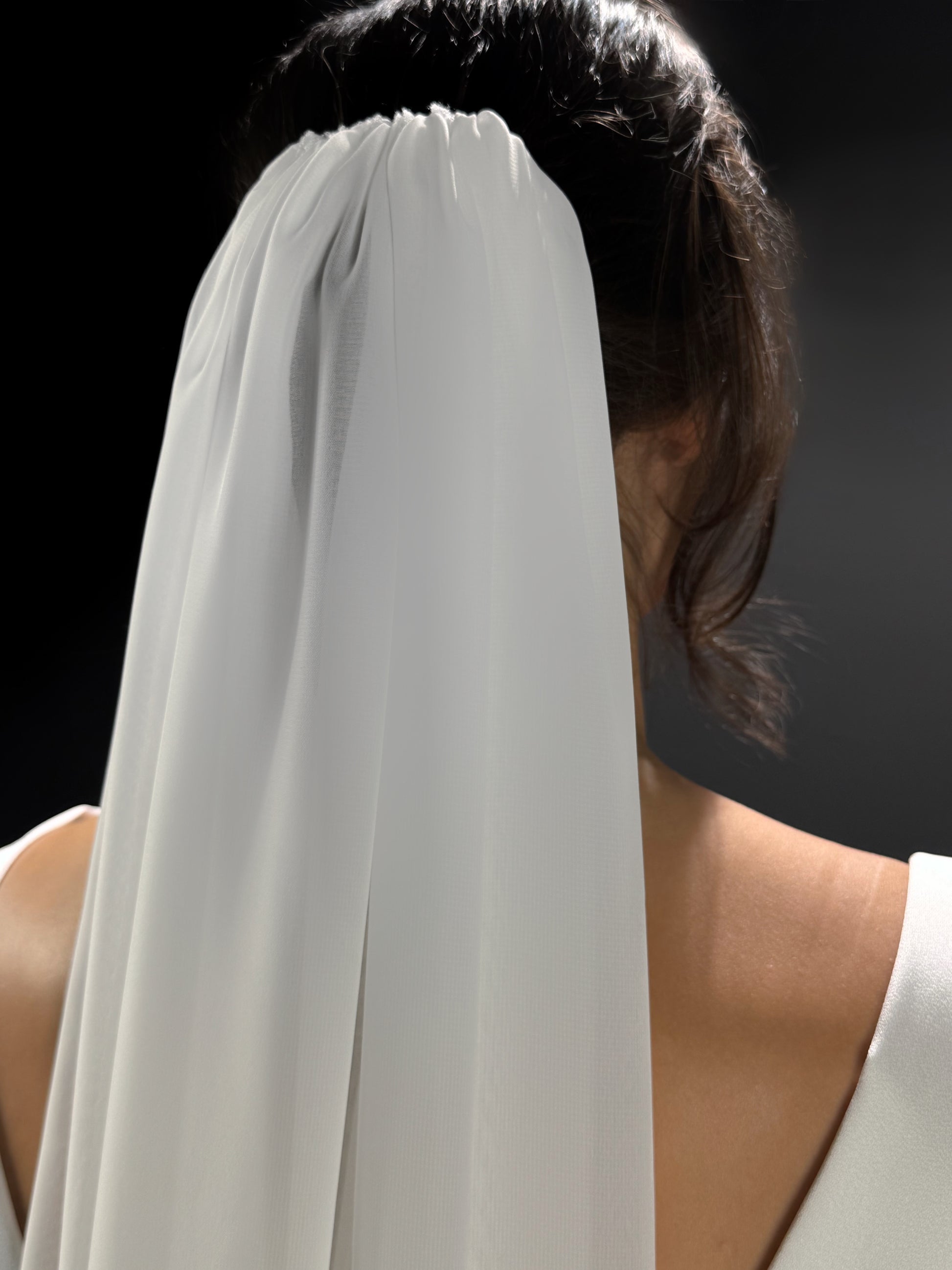 Voile en mousseline se distingue par sa légèreté et sa fluidité, offrant une longueur spectaculaire qui sublime la silhouette avec grâce. Une pièce délicate et raffinée, pensée pour compléter la robe avec élégance et sophistication.